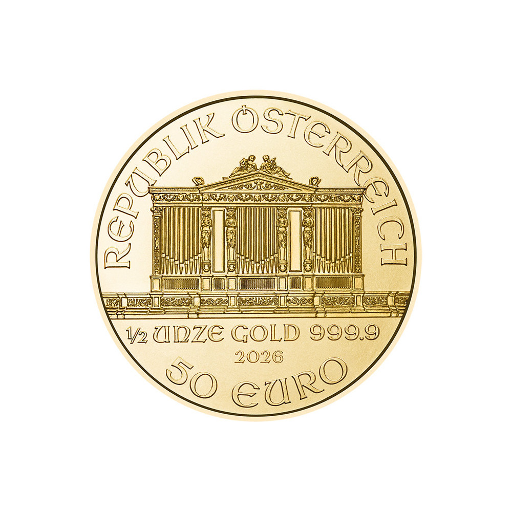 Viedenská filharmónia vďačí za svoj názov slávnemu rakúskemu orchestru, ktorý patrí k najlepším na svete. Na prednej strane zlatej mince je zobrazený veľký organ viedenského Musikvereinu. Pod organom je vyrazená hmotnosť 1/2 unce, rýdzosť 999,9, rok razby a nominálna hodnota 50 EURO. Nad ním je vyrazený nápis "REPUPLIK ÖSTERREICH". Na rubovej strane sú zobrazené niektoré hudobné nástroje filharmónie a na hornom okraji je názov orchestra a označenie zlatej mince "WIENER PHILHAMRONIKER". Podobne ako vyššie uvedené zlaté mince, aj Viedenská filharmónia je k dispozícii vo veľkostiach 1 unca, 1/4 unca, 1/10 unca a 1/25 unca.