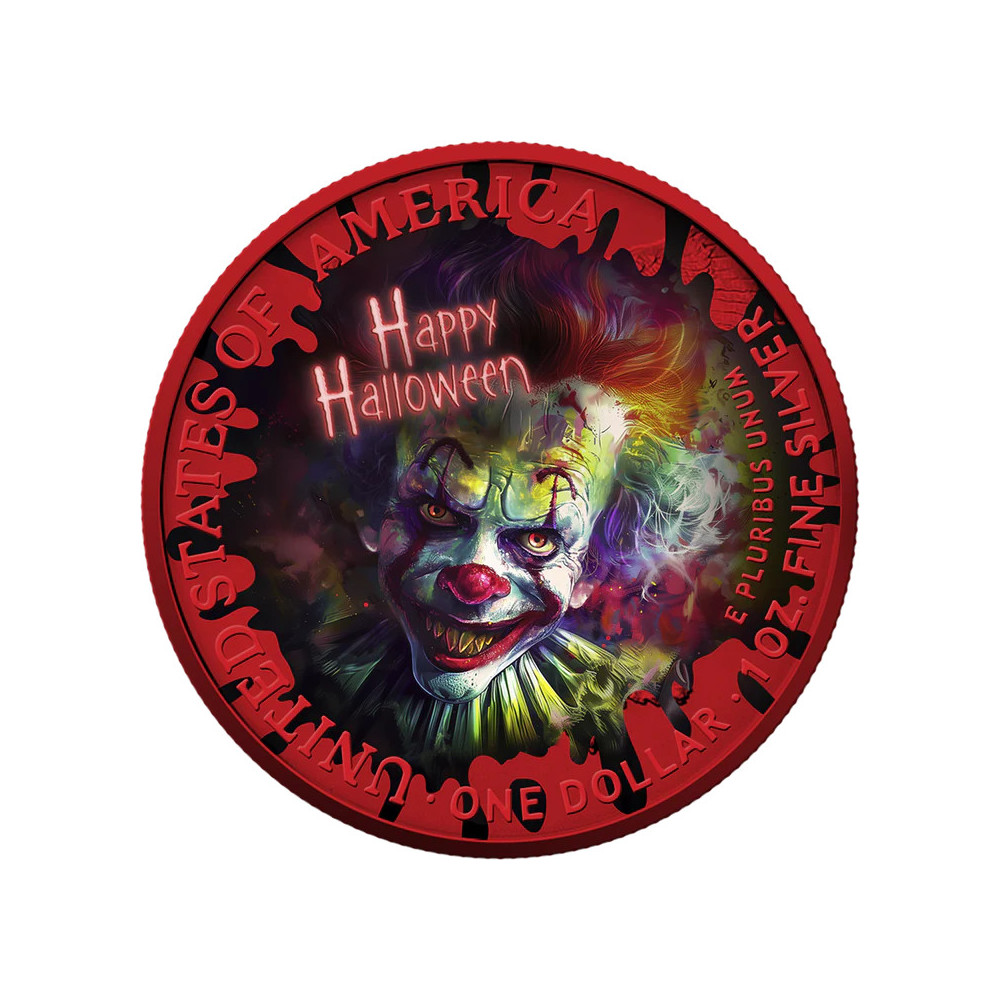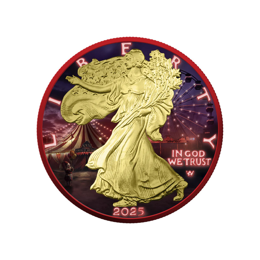 USA 2025 - strieborná minca American Eagle 1 oz - Creepy Smile (zlatá, vesmírne červená, farebná) je prémiová limitovaná halloweenska minca inšpirovaná slávnymi postavami z nočných môr. Každá minca je vyrobená z pravého amerického striebra Eagle s hmotnosťou 1 oz (rýdzosť 0,999) a po vyrazení je upravená živými farbami, efektom vesmírnej červenej a selektívnym pozlátením, aby získala výrazný zberateľský vzhľad. Táto edícia je celosvetovo limitovaná na 300 kusov a dodáva sa v ochrannej kapsule Quadrum s personalizovaným obalom so zodpovedajúcou grafikou a špecifikáciami.