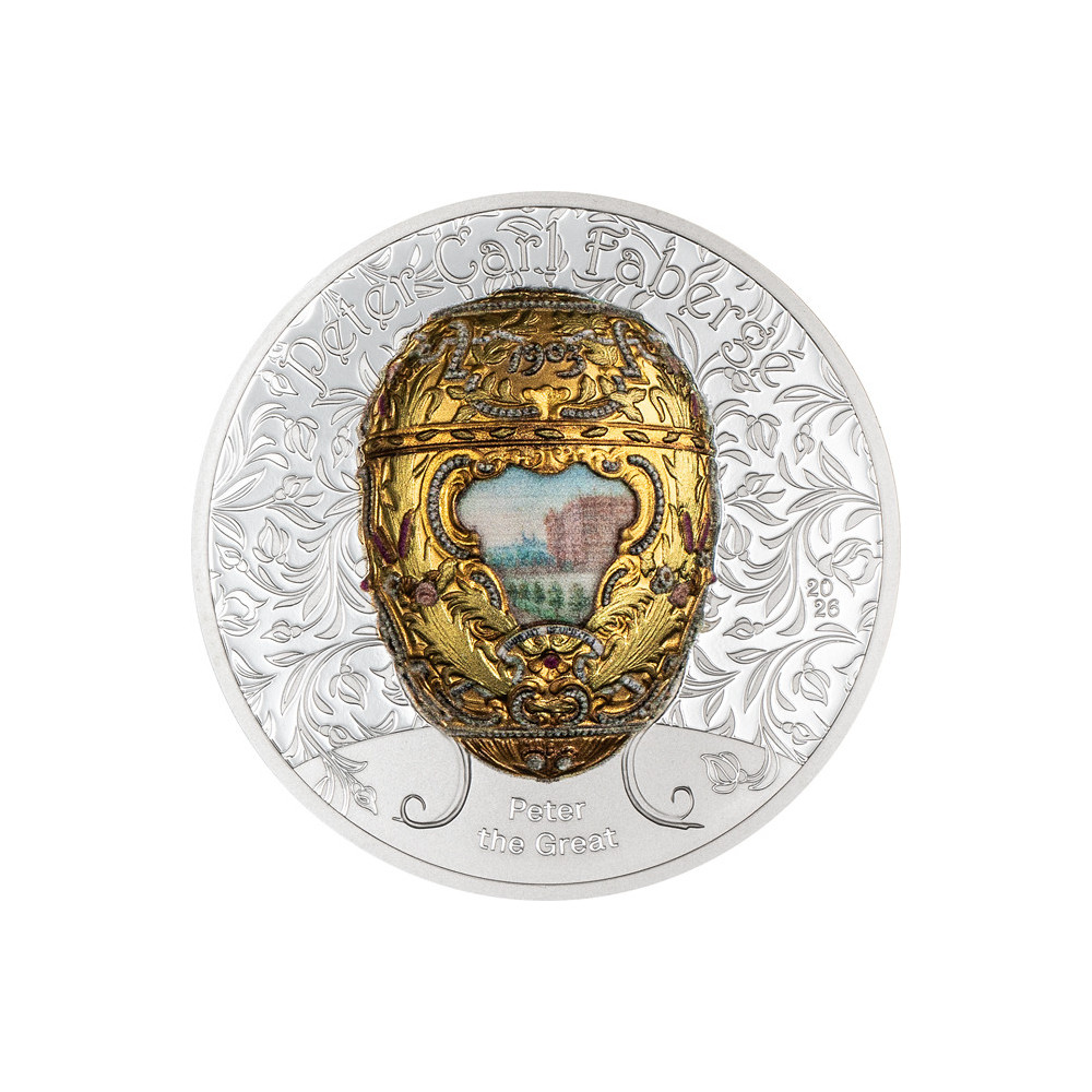 S povrchovou úpravou proof a doplnený lesklým nápisom "Peter Veľký" vyniká motív mince s pozoruhodnou hĺbkou. S výškou reliéfu približne 2,2 mm a charakteristickým vrúbkovaným okrajom je tento zberateľský kúsok nielen technickým majstrovským dielom mincovníctva, ale aj poctou bezkonkurenčnému umeleckému majstrovstvu Petra Carla Fabergého.