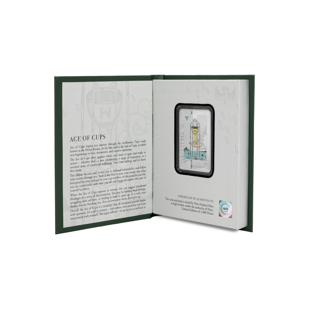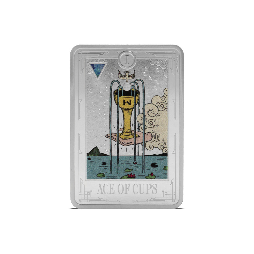 Táto zberateľská strieborná minca štvorcového tvaru bola vyrazená z 1 unce 99,9 % čistého striebra v najvyššej kvalite PROOF. Jej motívom je prvá karta z tarotových kariet Minor Arcana, ktorá predstavuje Ace of Cups. Táto jedinečná karta zobrazuje ruku súcitu, ktorá vystupuje z nadýchaného strieborného mraku a drží Posvätný pohár lásky – zlatý kalich pretekajúci piatimi prúdmi vody života. Vyjadruje, že božská milosť nekonečne prúdi k tým, ktorí sú otvorení jej prijímaniu. Pod motívom je jazero s kvitnúcimi leknínmi. Nad motívom, v hornej časti mince, je číslo „1“ označujúce sériové číslo karty a v ľavom hornom rohu vidíme trblietavý svetlomodrý trojuholník, ktorý predstavuje alchymistický symbol vody. Celý motív mince je orámovaný zrkadlovým lesklým povrchom (PROOF) a v spodnej časti mince je vygravírovaný názov karty a mince „ACE OF CUPS“. Lesklý pravý okraj mince obsahuje informácie o hmotnosti a čistote „1 oz 999Fine Silver“.