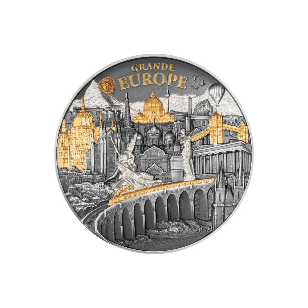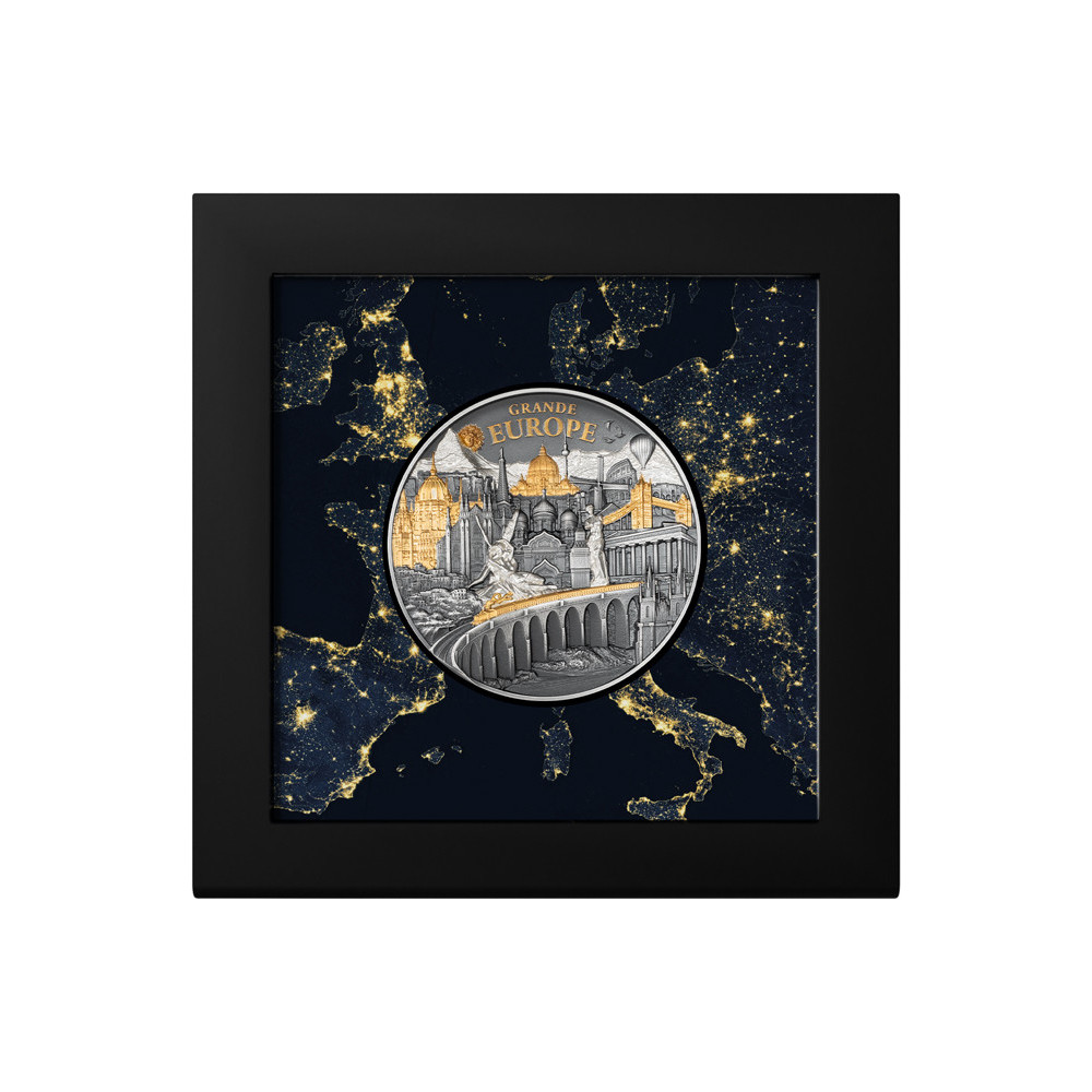 Táto úžasná 3-uncová strieborná minca "Hidden Treasure - Grande Europe" oslavuje najvýznamnejšie európske pamiatky v podmanivom dizajne skrytého objektu, ktorý obsahuje viac ako 20 pamiatok a tajne ukrytú mačku. Vďaka technológii inteligentného razenia, antickým povrchom, detailom v kvalite proof a čiastočnému pozláteniu vytvára živý 3D efekt s prvkami, ktoré presahujú okraj mince. Dodáva sa v elegantnej škatuľke s certifikátom pravosti a je limitovaná len na 500 kusov na celom svete.