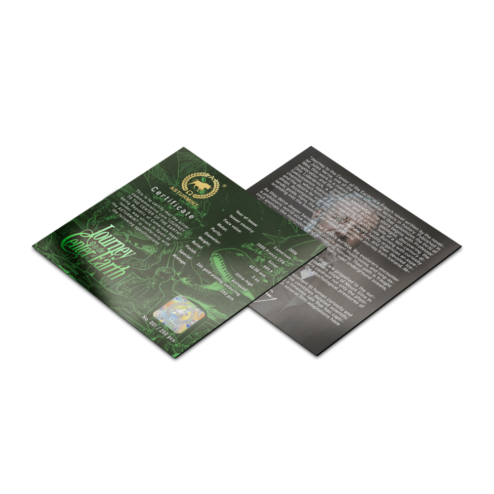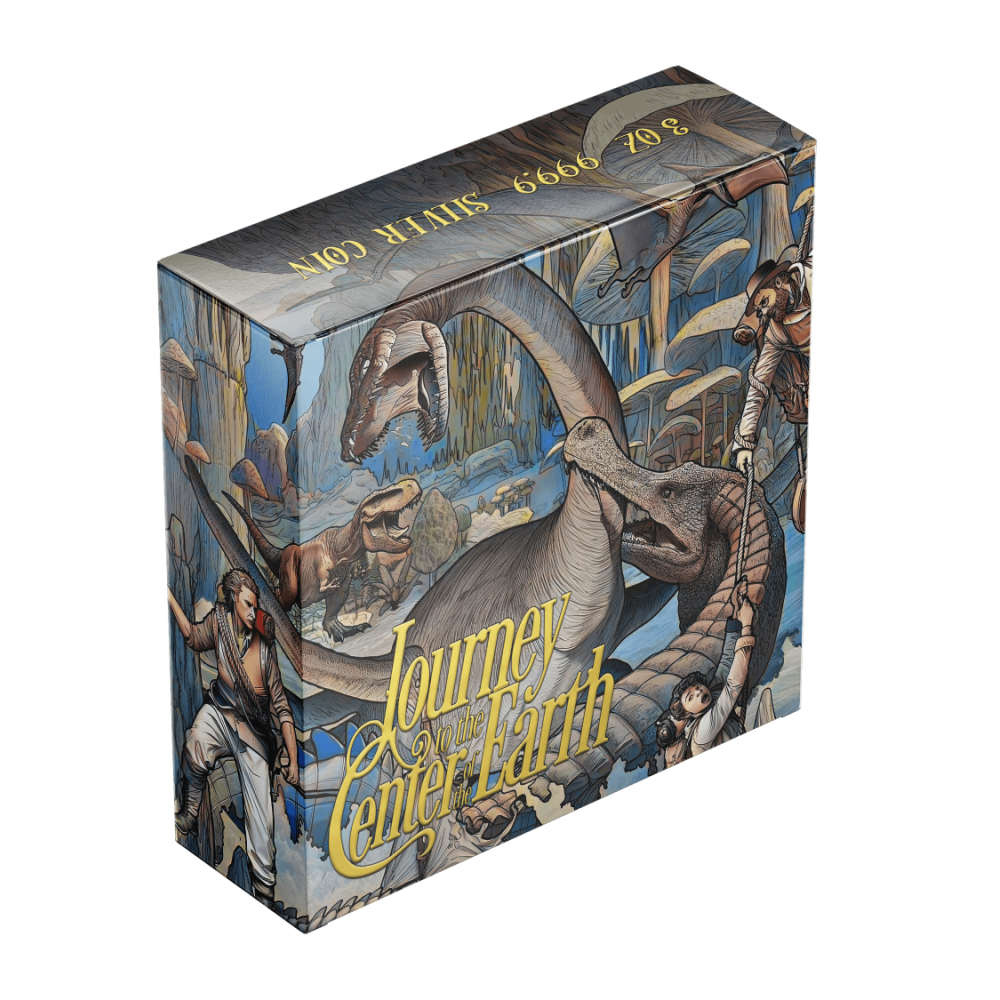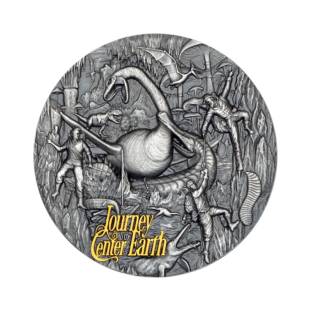 Táto nádherná 3-uncová strieborná minca sa ponára do románu Julesa Verna "Cesta do stredu Zeme". Horúčkovité ambície profesora Lidenbrocka ťahajú Axela temnými žilami strachu a úžasu. Starobylý povrch evokuje prach dávnych jaskýň. Mimoriadne vysoký reliéf sa dvíha ako rozoklané skaly. Selektívne zlátenie žiari ako iskra objavu. Minca je uložená v puzdre s certifikátom pravosti. Na svete existuje len 250 kusov.