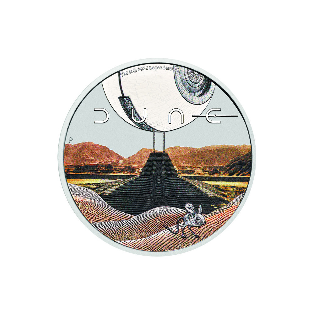 ktorú navrhol Sean Rogers, je farebná scéna z planéty Arrakis. V pozadí je monumentálna loď cisára a cisársky stan na pozadí rozľahlých púští. V popredí je púštna myš Muad'Dib, symbol prispôsobivosti a duchovnej sily ľudu Fremenov. Kompozícia obsahuje aj logo Duny a značku mincovne "P".