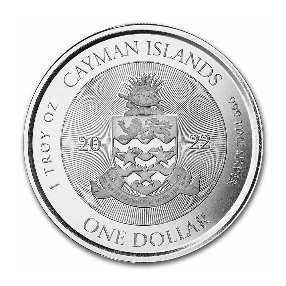 Zobrazuje erb Kajmanských ostrovov spolu s údajmi o hmotnosti kovu, rýdzosti a nominálnej hodnote.