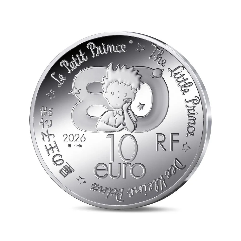Na rubovej strane mince je nad nominálnou hodnotou logo 80. výročia Malého princa, ktoré tvorí busta postavy opierajúcej sa o ruku pred číslom 80. Po hrane je nápis "Le Petit Prince" vo francúzštine, angličtine, nemčine a japončine, ktorý pripomína univerzálny rozmer tejto postavy. Súčasťou sú aj písmená RF, značky ryteckej dielne a majstra rytca a rok 2026.