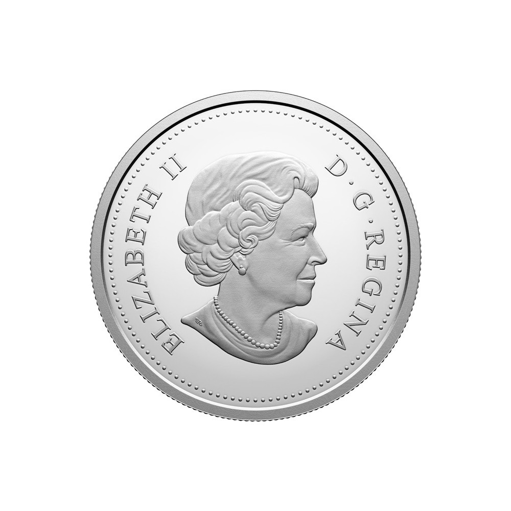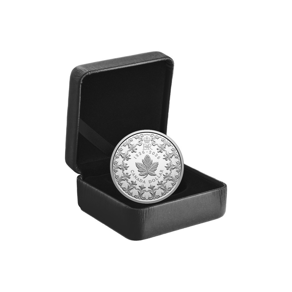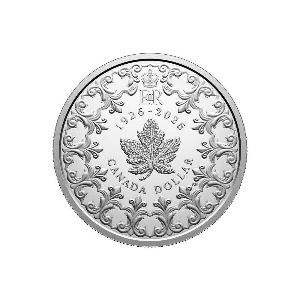 Tento dolár z 99,99 % rýdzeho striebra pripomína 100. výročie narodenia kráľovnej Alžbety II. a je na ňom vyobrazená jedinečná kanadská pocta: diamantová brošňa v tvare javorového listu, ktorú nosila kráľovná Alžbeta II. ako symbol svojho osobného vzťahu ku Kanade, doplnená kráľovským monogramom (hore), ktorý slúžil ako jej osobný znak. Vznešený list je korunovaný filigránovými ozdobami symbolizujúcimi pôvab a dedičstvo a obsahuje 13 javorových listov (jeden pre každú provinciu a teritórium) zasadených do negatívneho priestoru filigránu - jemná, ale hlboká pocta, ktorá preniká celým umeleckým dielom, podobne ako neochvejná prítomnosť kráľovnej Alžbety II. v kanadskej histórii.